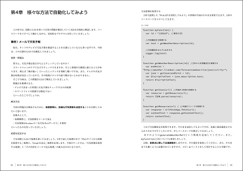 GASの使い方から簡単なスクリプト、少し高度な使い方まで豊富なソースコードを多数収録。様々な作業を自動化・効率化するためのノウハウをわかりやすく紹介しています。