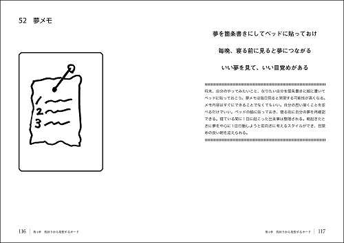 本書はプランナーのくぼたつこと久保田達也氏が1枚のカードの絵をヒントに思考のノウハウを解説した『くぼたつ式思考カード54(副題:新しいことを考え出す知恵と技術)』の続編です。成果重視で見逃されてしまったライフスタイルに着目し、思考の素となる「ひらめき」を生活の中に発見する方法を紹介します。身近な物事を題材に、ひらめきが出るようになる生活の工夫や、クリエイティブな発想の基盤としてライフスタイルの改善を提案します。