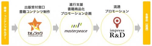 出版センターの窓口となるのが、福岡で障がい者就労継続支援A型事業所を展開するカムラックです。九州を含めた全国各地発信による多彩な出版企画を、同事業所に所属するエンジニア・デザイナーが「NextPublishing」を活用し書籍化します。書籍化の際、デジタル出版サービスを提供するmasterpeaceが企画・進行を支援し、good.bookブランドで電子書籍および印刷書籍として発行します。発行した書籍については、インプレスR&Dを通じて、インプレスグループが流通・プロモーションを担います。