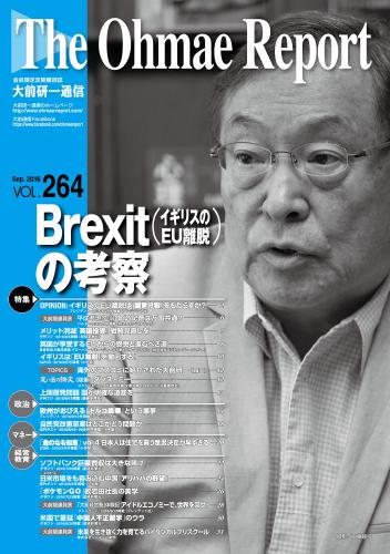 アマゾンPODにて販売を開始する『大前研一通信 Vol.264』は、「Brexit」に関連する記事を中心に構成した「Brexit(イギリスのEU離脱)の考察」と題する特集号です。後半には、難民流入の防波堤になっているトルコとヨーロッパ諸国の関係に関する記事や、英国のARM社を過去最大規模で巨額買収したソフトバンク、上関原原発問題、米国で蔓延する「中国人不正留学」の記事、社会現象にもなった「ポケモンGO」などの時事問題に加え、住宅問題を扱った連載記事、アイドルエコノミーにも言及している大前経営塾体験記に、BBTグループのバイリンガルプリスクールなどの関連記事と、大前研一氏の母親の思い出を綴った随筆「ダンス・ミー」を思い出の論文として紹介しています。