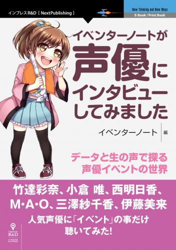 インプレスグループで電子出版事業を手がける株式会社インプレスR&D(本社:東京都千代田区、代表取締役社長:井芹昌信)は、竹達彩奈、小倉唯など人気女性声優6名へのインタビューやアニメ・声優ファンのデータ分析と生の声、アニサマ齋藤光二プロデューサーなどのキーマンへのロングインタビューなどからでアニメイベントの新時代に迫る『イベンターノートが声優にインタビューしてみました』を6月24日に発行いたします。