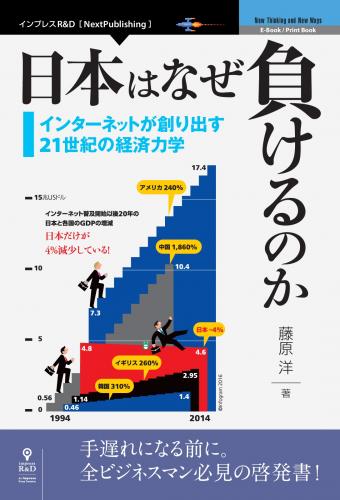 本書では、まず1994年を起点にした「失われた20年」を題材に、現状、日本が世界において劣勢に甘んじている理由を論じています。その端的な事実は、世界の主要各国と比較して日本のGDPだけが減少していることです。最大の原因は、日本だけが「インターネットというイノベーション」への対応ができていない点にあります。