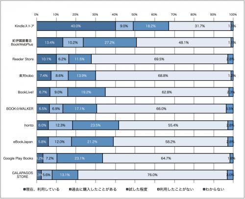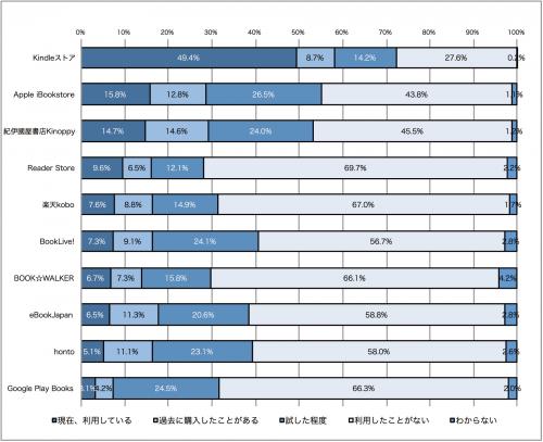 一方、2013年2月に日本でサービスを開始したアップルのiBookstoreは、利用率15.8%で初登場2位となりました。前回2位だった紀伊國屋書店Kinoppyは、14.7%と利用率を伸ばしたものの3位に後退。以下、Reader Store、楽天kobo、BookLive!と続いています。