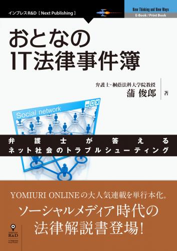 インプレスグループで法人向け情報コミュニケーション技術関連メディア事業を手がける株式会社インプレスR&D(本社:東京都千代田区、代表取締役社長:井芹昌信)は、次世代型書籍出版メソッド「Next Publishing」を使い、『おとなのIT法律事件簿』(副題:弁護士が答えるネット社会のトラブルシューティング/著者:蒲 俊郎 )を発刊いたしました。