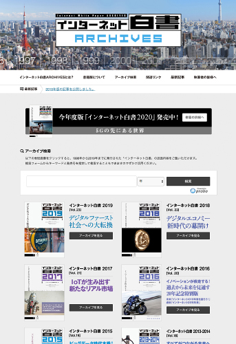 「インターネット白書ARCHIVES」(インターネット白書アーカイブス)は、インターネットの黎明期(1996年)からの歴史を年鑑として発行し続けている「インターネット白書」のバックナンバーをデジタル化し、無料で検索・閲覧できるようにしたWebサービスです。発行後1年を経過した「インターネット白書」をアーカイブスに登録しています。